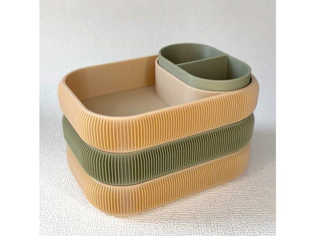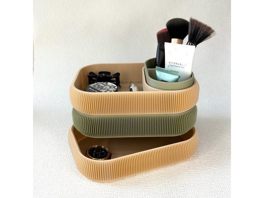 Jeho jemně zaoblený tvar a výrazná 3D textura působí moderně a zároveň příjemně útulně. Kombinace barev dodává organizéru jedinečný charakter, který krásně oživí toaletní stolek, koupelnu nebo pracovní kout.